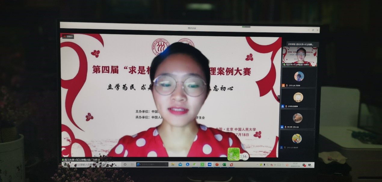 “SCU冲鸭小队”的案例分析报告在初赛复审环节取得了所有参赛队伍的最好成绩;复赛与决赛中的现场答辩效果也获得了各位评委老师的一致好评;“SCU冲鸭小队”队长孙春玲同学被选为参赛选手代表在颁奖仪式上发言。全体参赛队员充分展现了川大行管学子良好的精神风貌与卓越的学术风采。