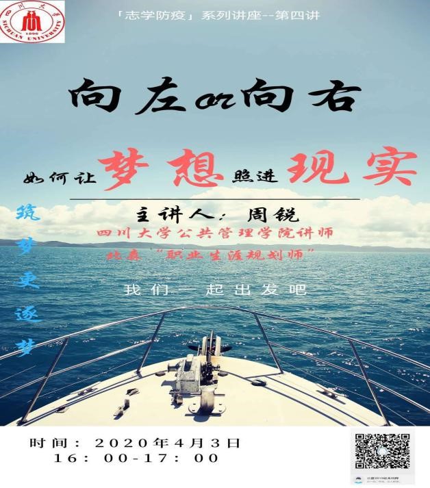 2020年4月3日下午4:00,四川大学公共管理学院周锐老师应邀为2019级本科同学作了“向左or向右:如何让梦想照进现实”的主题讲座。