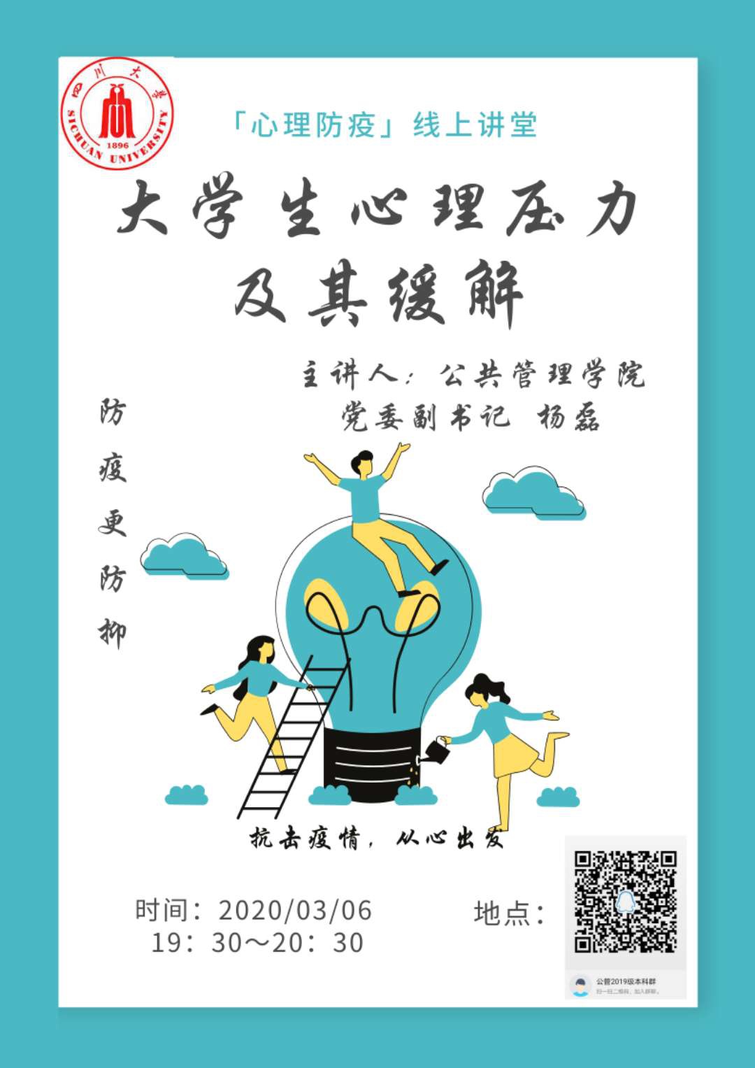 2020年3月6日晚7:30,公共管理学院党委副书记杨磊老师在QQ群课堂里为2019级本科同学作了题为“大学生心理压力的宣泄与疏解”的线上讲座。本次讲座也拉开了“志学防疫”系列线上讲座的序幕。
