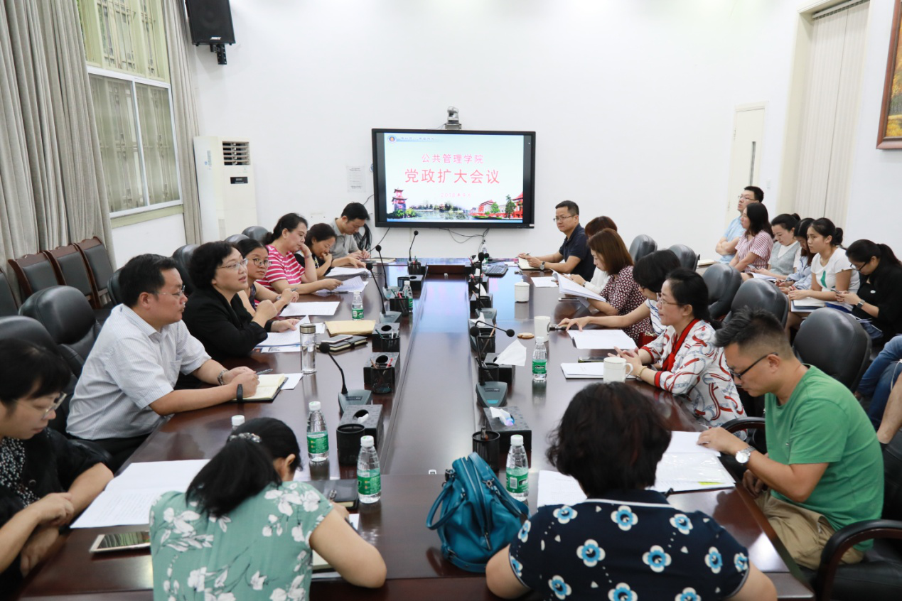 9月5日下午,公共管理学院在萃文楼311会议室召开党政联席扩大会,深入学习“学校2018年下半年新学期工作部署会”精神,专题研讨学院新学期重点工作。会议由党委书记姜晓萍同志主持,学院班子全体成员、党委委员、系主任、党支部书记、部分教师、学生代表参加。