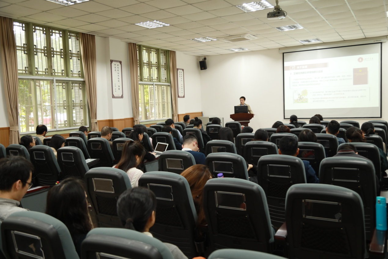 10月12日下午,我院邀请了校纪委副书记滕文浩在萃文楼105室作了《明规矩 知敬畏 筑牢纪律底线》专题讲座。讲座由学院党委书记姜晓萍教授主持,学院全体教职工党员参加了本次讲座。
