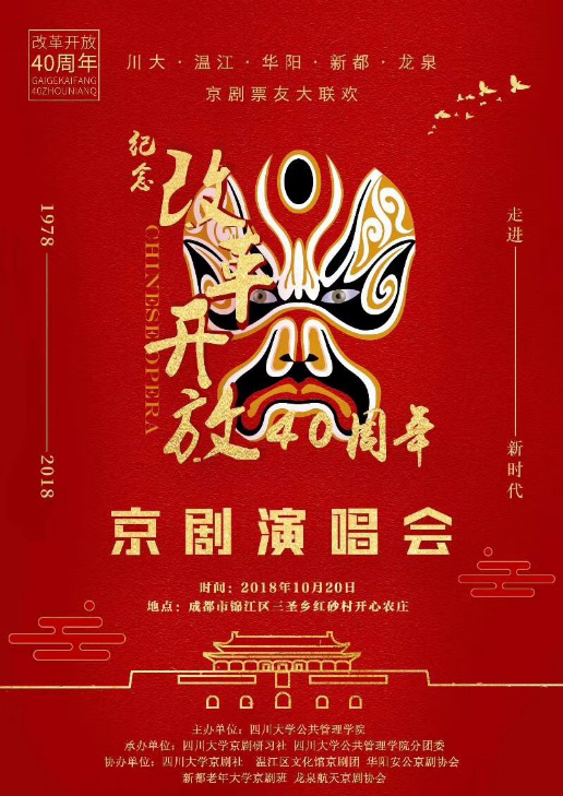 在改革开放40年之际,四川大学京剧社作为西南地区第一家学生京剧社团,经过八年的发展,秉承“以青春的名义弘扬国粹”的宗旨,为时代放歌,期望通过传统戏曲艺术的方式,培养当代大学生的家国情怀。近年来,在校院的领导下,四川大学京剧社不断发展,先后荣获全国高校京剧演唱研讨会组织奖、有两人荣获全国高校京剧演唱研讨会一等奖,多人荣获二等奖、三等奖。