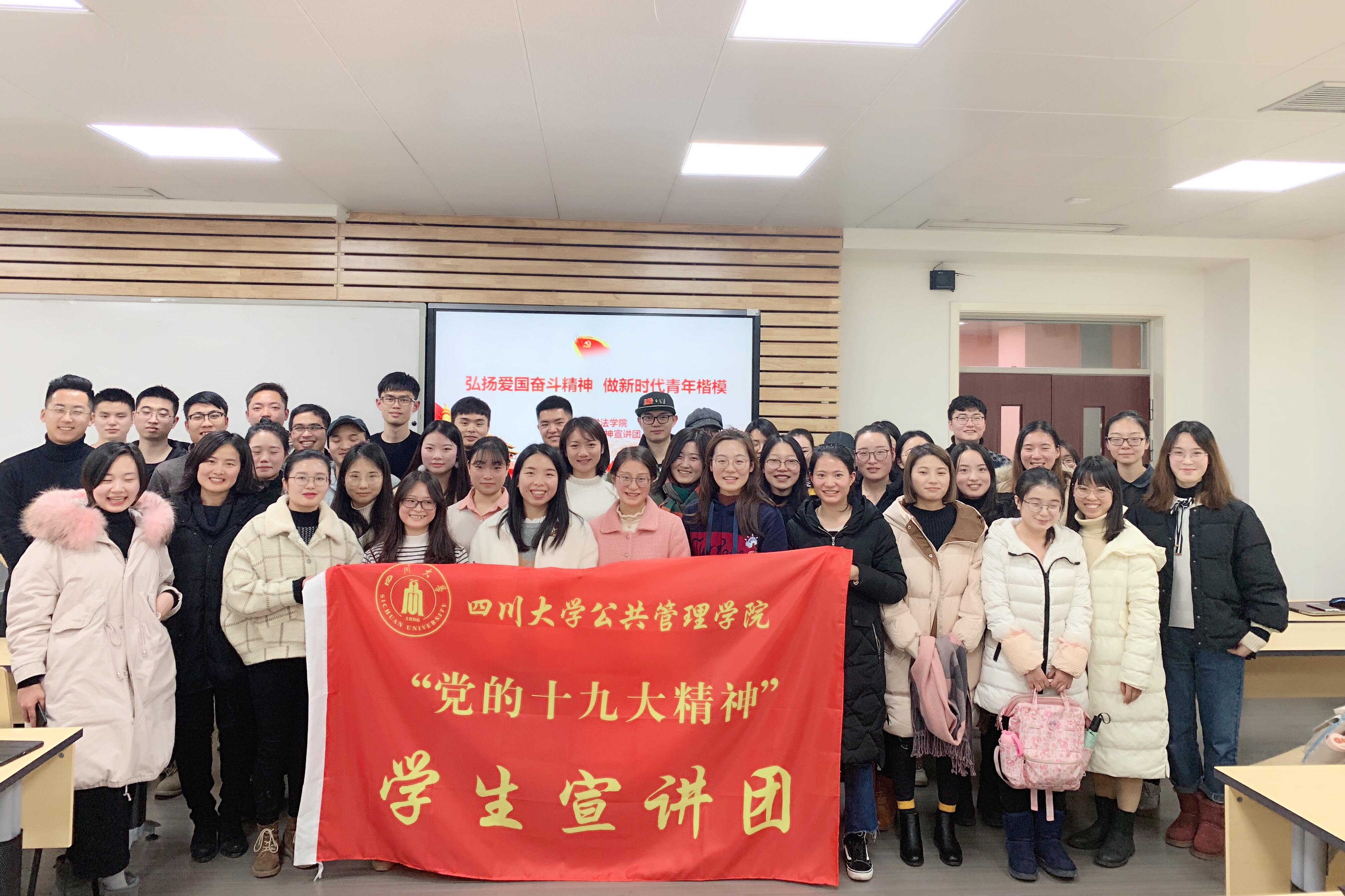 为持续推动学习宣传贯彻党的十九大精神热潮,鼓舞同学们深刻领会报告的丰富内涵,把思想和行动统一到党的十九大精神上来,12月12日,公共管理学院2017级研究生党支部、学院“党的十九大精神”学生宣讲团在望江校区基础教学楼A座408教室联合法学院举办了“弘扬爱国奋斗精神,做新时代青年楷模”的主题宣讲会。2017级研究生第二、第四支部全体党员、法学院部分研究生党员参加了此次活动。2017级研究生第四支部书记青杨媚老师出席活动并讲话。