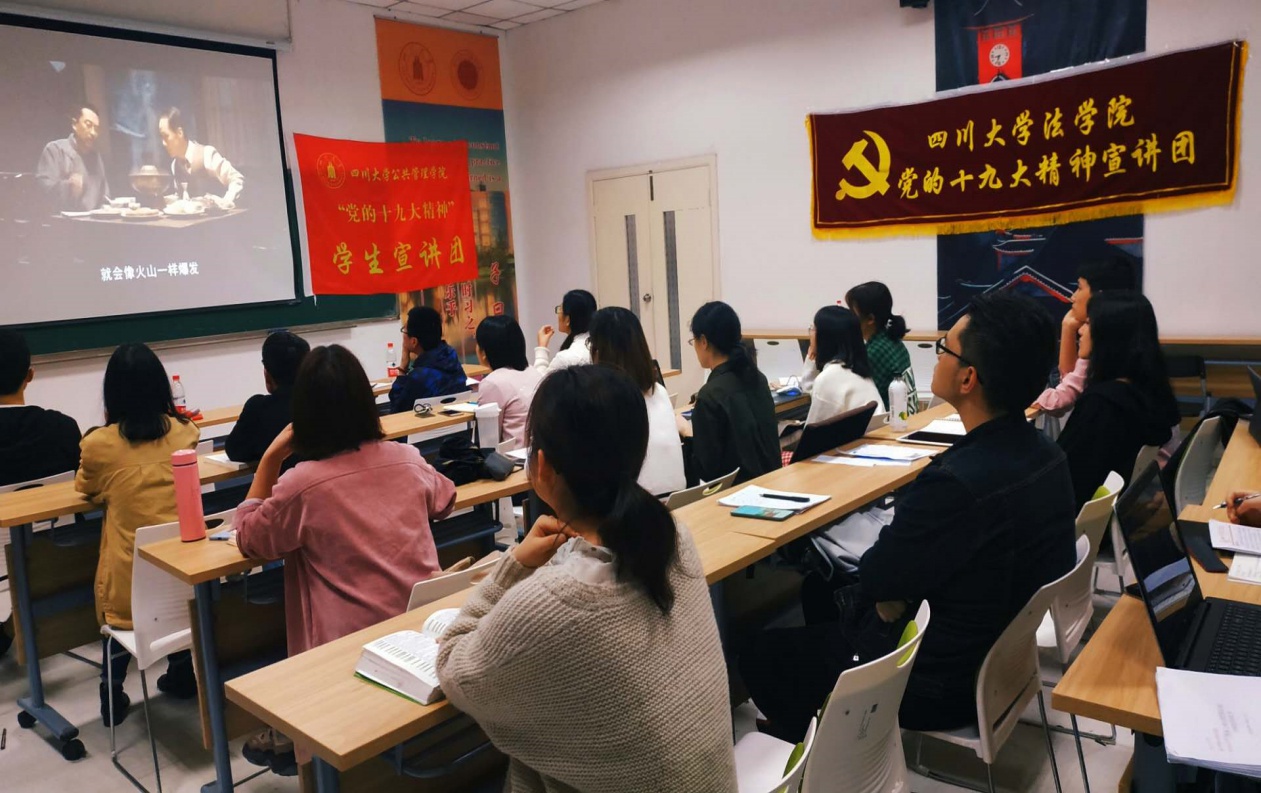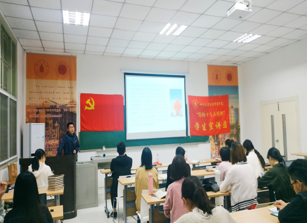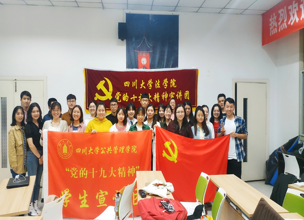 今年是中华人民共和国建国70周年、五四运动100周年。为了激励和引领青年大力弘扬以爱国主义为核心的伟大民族精神,坚定“四个自信”,矢志投身新时代夺取中国特色社会主义伟大胜利的新征程,响应团中央工作部署及学校的相关工作要求,“党的十九大精神”公共管理学院宣讲团、法学院宣讲团和公共管理学院2017级研究生第三党支部于4月20日晚19:30在望江校区公共管理学院305教室共同举办了“青春心向党 建功新时代”的主题宣讲活动。