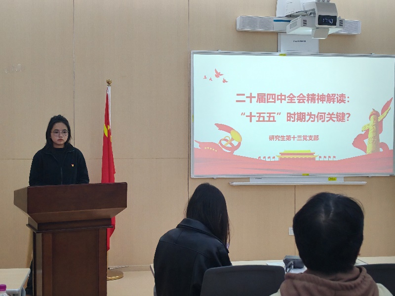 11月25日,中共四川大学公共管理学院研究生第十三党支部在望江校区萃文楼组织开展党的二十届四中全会精神专题学习。本次政治学习由研究生第十三党支部宣传委员冯媛主持,全体党员参加。