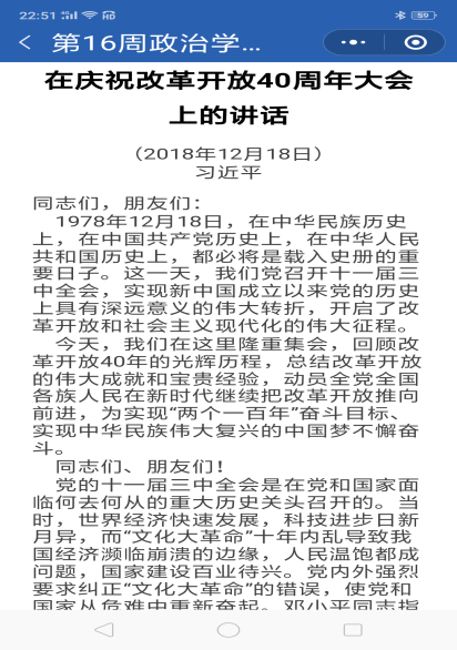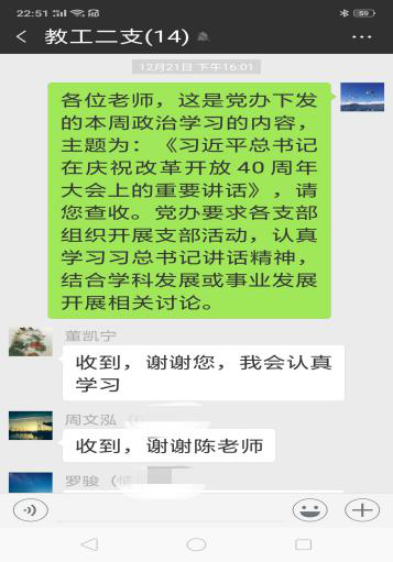 2018年12月21日,按照公共管理学院党委统一要求,教工第二党支部召开学习“习近平总书记在庆祝改革开放40周年大会上的重要讲话精神”主题微信群在线学习交流会。支部全体党员教师参加了本次学习活动。