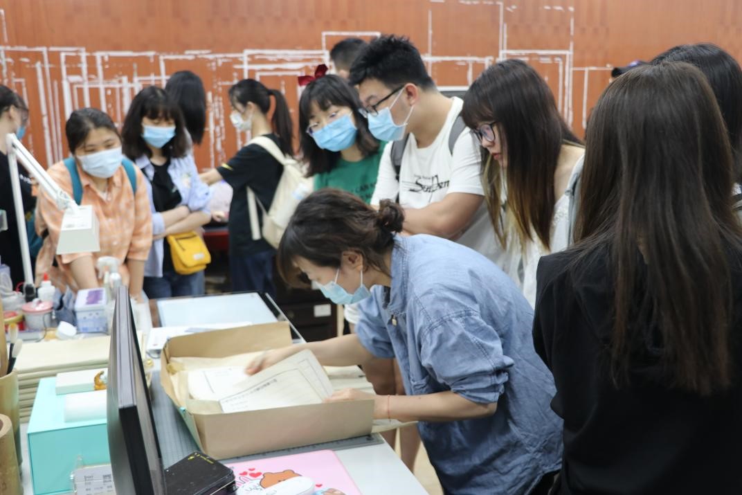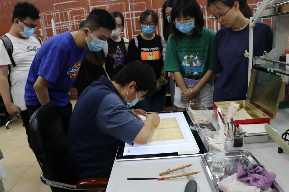 古籍修复师用双手让古籍重生,整旧如旧,便是对它们最好的保护。一本本古籍在老师们的指间恢复生命力,老师们用手艺缝补历史的缝隙,让沉睡千百年的文物在他们手中渐次苏醒,重获“新生”。而同学们看见那些历经千百年的纸张触手可及,仿佛永恒的时光就在眼前流淌,一段段的历史过往在当今再现,感叹古籍保护对未来的重要性。