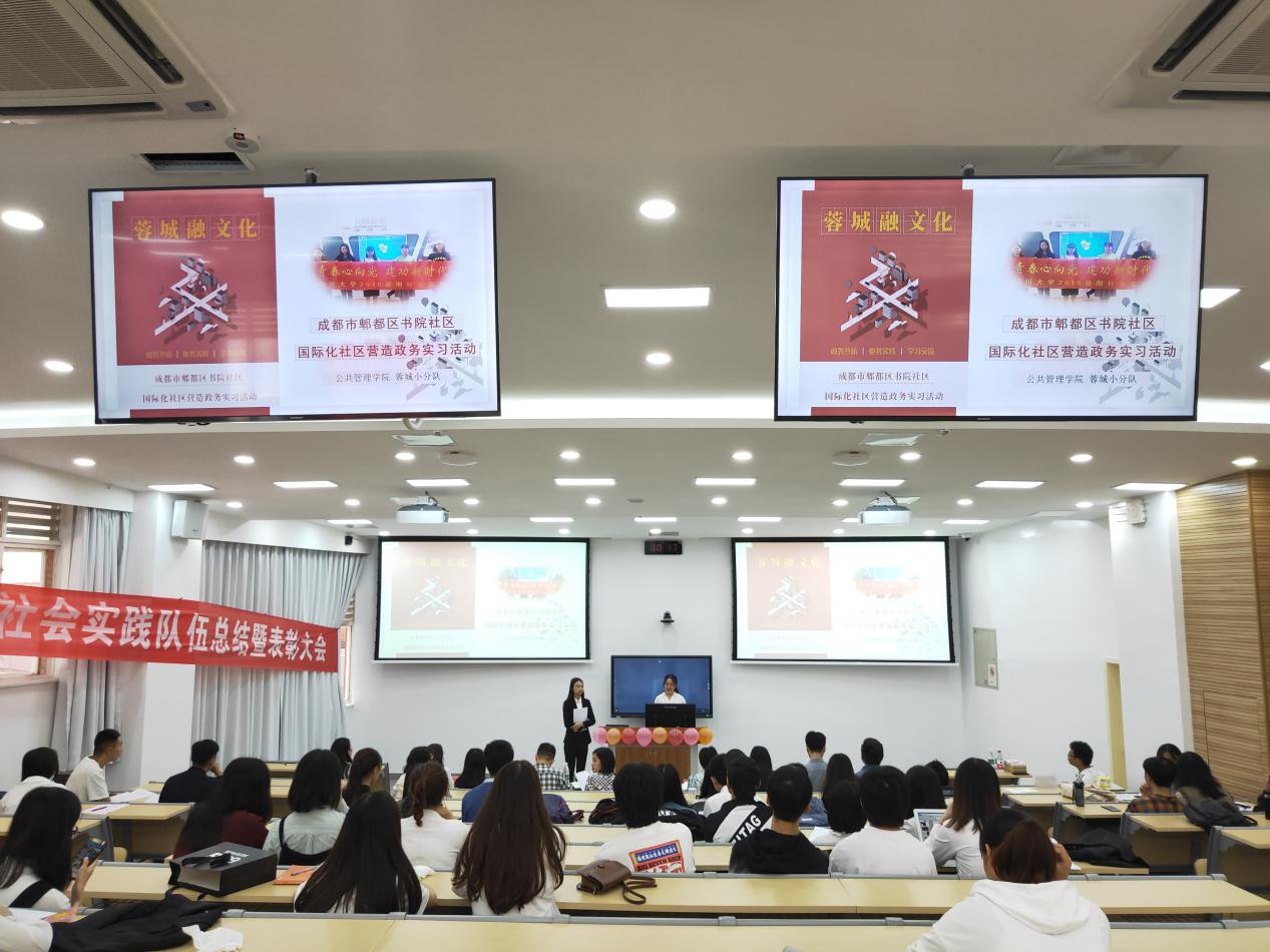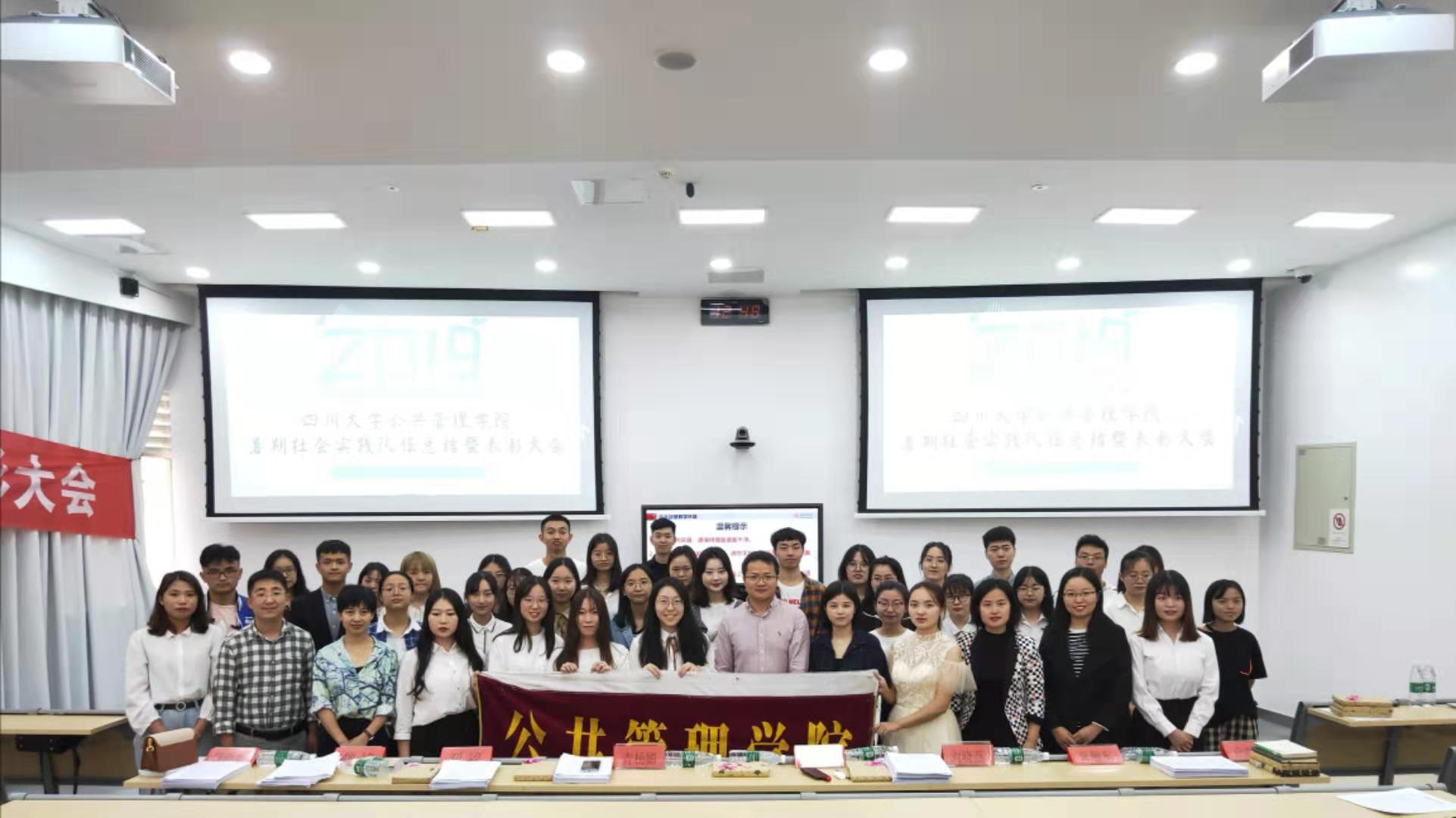 为响应团中央发出的“青春告白祖国”的号召,引领青年学生了解国情、社情,鼓励青年学生从社会实践中感悟祖国发展,公共管理学院从7月份起开展了“小我融入大我,青春献给祖国”系列主题暑期社会实践活动。活动范围覆盖全国11个省(市、自治区),共130名同学参与到活动中来。为了鼓励更多同学深入祖国各地开展社会实践,丰富同学们的第二课堂,也为了对暑期社会实践的活动经验进行总结,对实践成果优异的队伍进行表彰,学院于2019年9月27日上午在望江校区基础教学楼C202举行了暑期社会实践总结暨表彰大会。学院党委副书记杨磊老师、团委书记青杨媚老师,陈萱源老师、刘晓燕老师、刘碧老师以及其他嘉宾老师们出席了此次大会,聆听公管学子的青春故事。