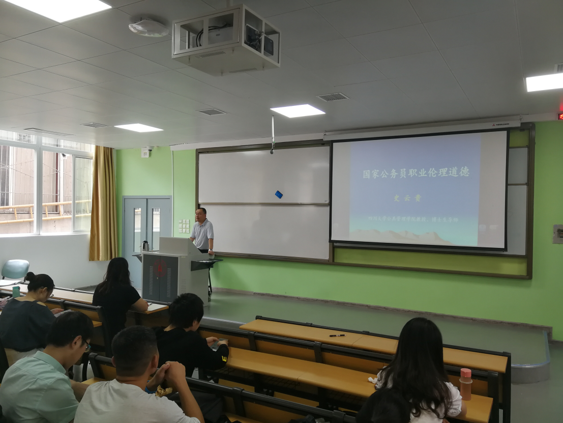 2019年6月21日下午,公共管理学院2016级本科思政公开课在东三教150教室成功举办,公共管理学院院长史云贵教授受邀担任主讲嘉宾,为同学们讲授了题为“国家公务员职业伦理道德”的思政公开课,2016级辅导员吴银雪老师主持了本次公开课。