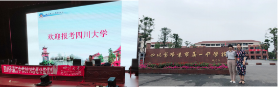 为响应新时代本科教育再升级的号召,积极助力我校一流学科建设和一流人才培养,按照学校统一部署,2019年6月23日,由我院青杨媚老师、周锐老师、陈萱源老师、方亚琴老师组成的本科招生宣传工作组分别深入邛崃市、蒲江县重点中学举办四川大学本科招生宣讲会并现场接受考生及家长的相关咨询。
