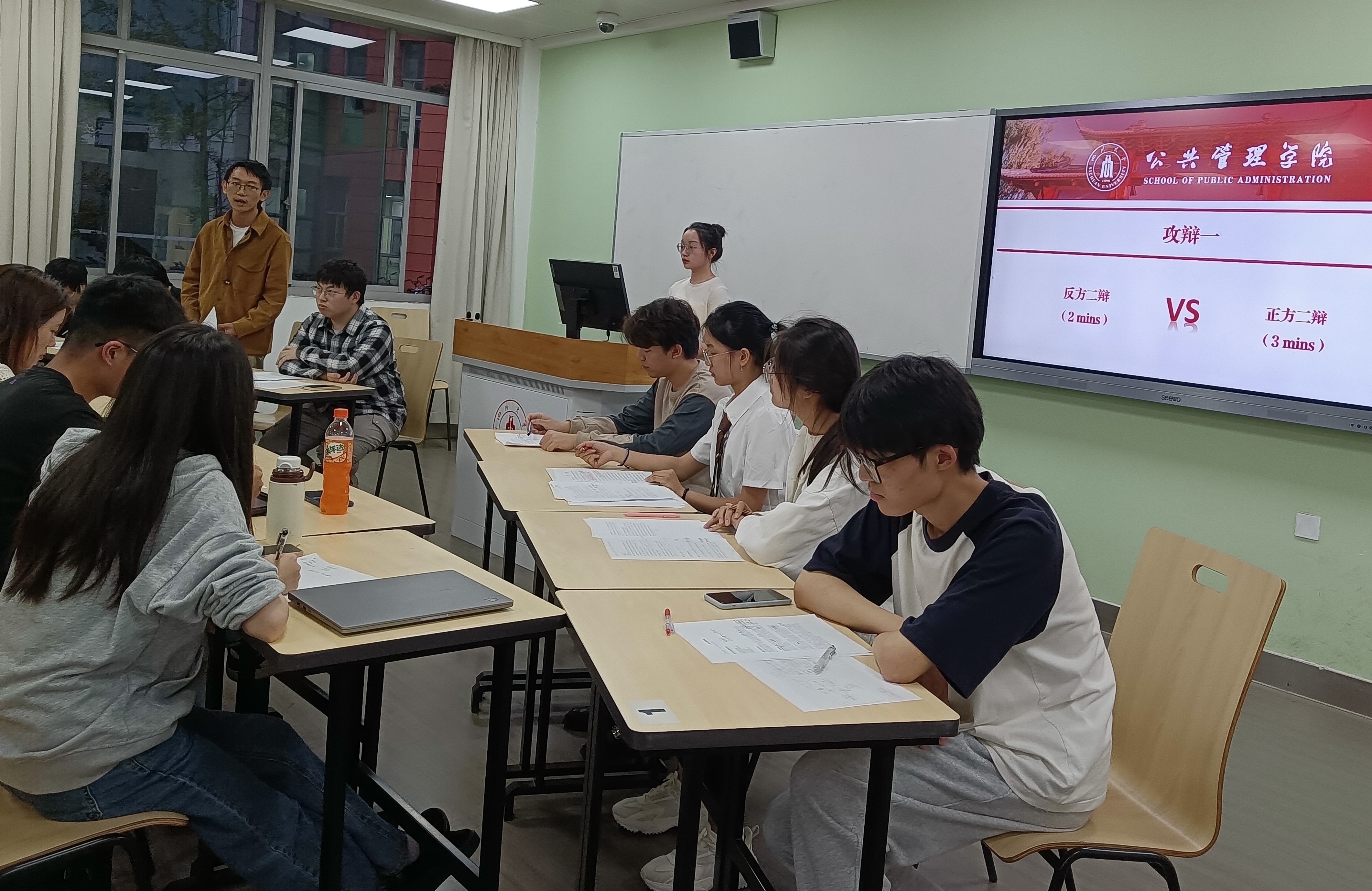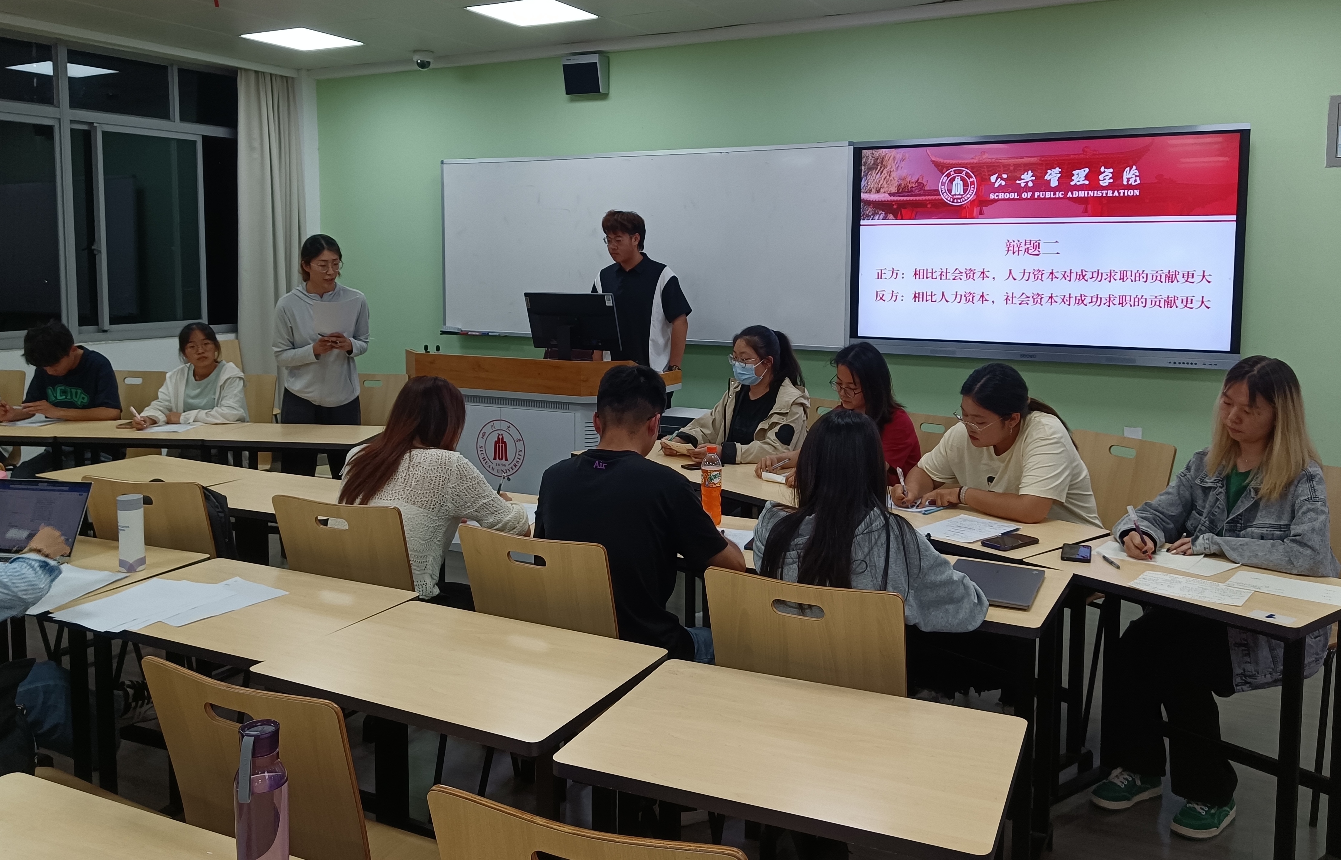 5月24日晚,在任课教师杨帆的精心组织下,《劳动经济学》课程辩论赛在江安校区第一教学楼C106教室成功举行。本次辩论赛共设三个辩题,每个辩题均关涉社会热点或劳动经济学的重要议题,分别是人工智能是否会导致大量失业、人力资本与社会资本对成功求职的贡献,以及劳动是否存在高低贵贱之分。三位来自公共管理学院的硕士研究生简丽敏、杨丹、刘伟同学担任评委。