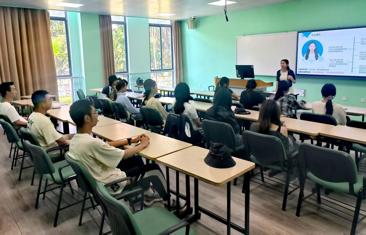见面会包括师生自我介绍、大类招生与专业分流、信息资源管理专业介绍和本科学习规划与建议四个环节。首先,刘老师和同学们分别进行自我介绍。在一环节中,同学们分享各自的兴趣爱好,迅速拉近了彼此距离,为班级营造了融洽氛围。随后,刘老师向新生同学介绍了学校的大类招生政策、学院概况与专业分流情况,并分享了在信息资源管理专业学习的经历,不仅让同学们对信息资源管理专业有了较全面的认知,更让同学们通晓了在大学提升个人能力与素质的多种途径。最后,刘老师建议同学们在大学期间主动探索、明确目标,平衡学业与兴趣,积极规划属于自己的成长路径。
