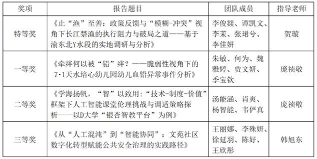 由我院劳动与社会保障系贺璇副教授指导,2023级劳动与社会保障专业本科生李俊燚、2023级行政管理系本科生谭凯文、2023级土地资源管理系李茉、张珺兮、李佳妍组成的团队,其参赛作品《止“渔”至善:政策反馈与“模糊-冲突”视角下长江禁渔的执行阻力与破局之道——基于渝东北Y水段的实地调研与分析》,荣获特等奖。