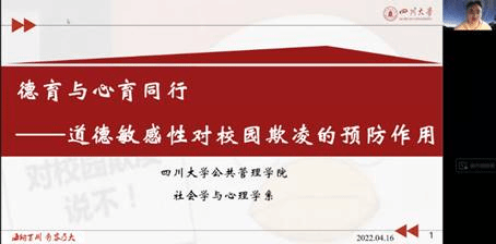 为了将研究结果反馈给一线教师,并推动校园欺凌干预课程的开发工作,4月16日,项目组召开了“德育与心育同行:道德敏感性对校园欺凌的预防作用”线上研讨会,校园欺凌领域专家、中小学校长及教师等约50人参会。刘传军老师对四川省社会科学“十四五”规划2021年度项目的资助、四川大学公共管理学院自主科研计划的支持,以及参与本次调研的专家及一线教师致以谢意后,应用心理硕士生谢忠桔对调研的基本过程与结果进行了总结汇报。在随后的自由讨论环节,沈潘艳副教授根据自身课程设计经验,提出可以从学生的认知失调、情绪觉察能力方面入手,引导学生关注受害者被欺凌时的具体情况以及由此带来的痛苦,以增加其对受害者的帮助行为。一线心理健康教师代表、来自天府四中的蔡倩老师,结合实务经历指出,一方面,欺凌相关的校园情景剧以及权威人士对欺凌法律责任的普及可能对反欺凌起到一定推动作用,而另一方面,为学生明确欺凌定义可能起到反作用,如“欺凌”一词可能成为学生之间取笑的工具,因此,反欺凌课程的设计中诸多细节不容忽视。