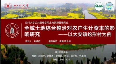 由我院土地资源管理专业2020级本科生刘婕妤、张健勇、曾昊辰、陶硕、张乐怡、仇思颖组成的国土治理小队,以《全域土地综合整治对农户生计资本的影响研究——以太安镇蛇形村为例》为题,从农户生计资本的角度对全域土地综合整治进行政策绩效评估,为全域土地综合整治的政策优化和可持续建言献策,获得“一等奖”的荣誉。