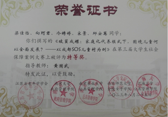 在我院劳动与社会保障系黄国武老师的指导下,2020级行政管理专业本科生梁佳怡、2021级行政管理专业本科生邱安苒、2021级劳动与社会保障专业本科生向珂君、冷娉婷、宋景五位同学组成参赛团队,通过前期讨论选题、克服实地调研的种种困难等,于七月底共同完成案例分析报告《破茧成蝶:家庭化代养模式下,困境儿童何以全面发展?——以成都SOS儿童村为例》,经过初赛专家评审,团队最终进入决赛,通过案例展示、现场答辩等突出表现,一举斩获全国特等奖,充分展现了川大公共管理学院学子“公成天下、管法自然”的浓厚情怀和扎实的学科素养。