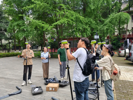 最后,工作人员进行天硕TS10 GNSS接收机的演示测量。先利用点测量功能采集控制点的GNSS点坐标,并在点数据中输入控制点对应的已知点坐标,然后使用参数计算功能计算现场坐标系统的转换参数。同学们也一同进行实际操作,更加熟悉整个测量过程。