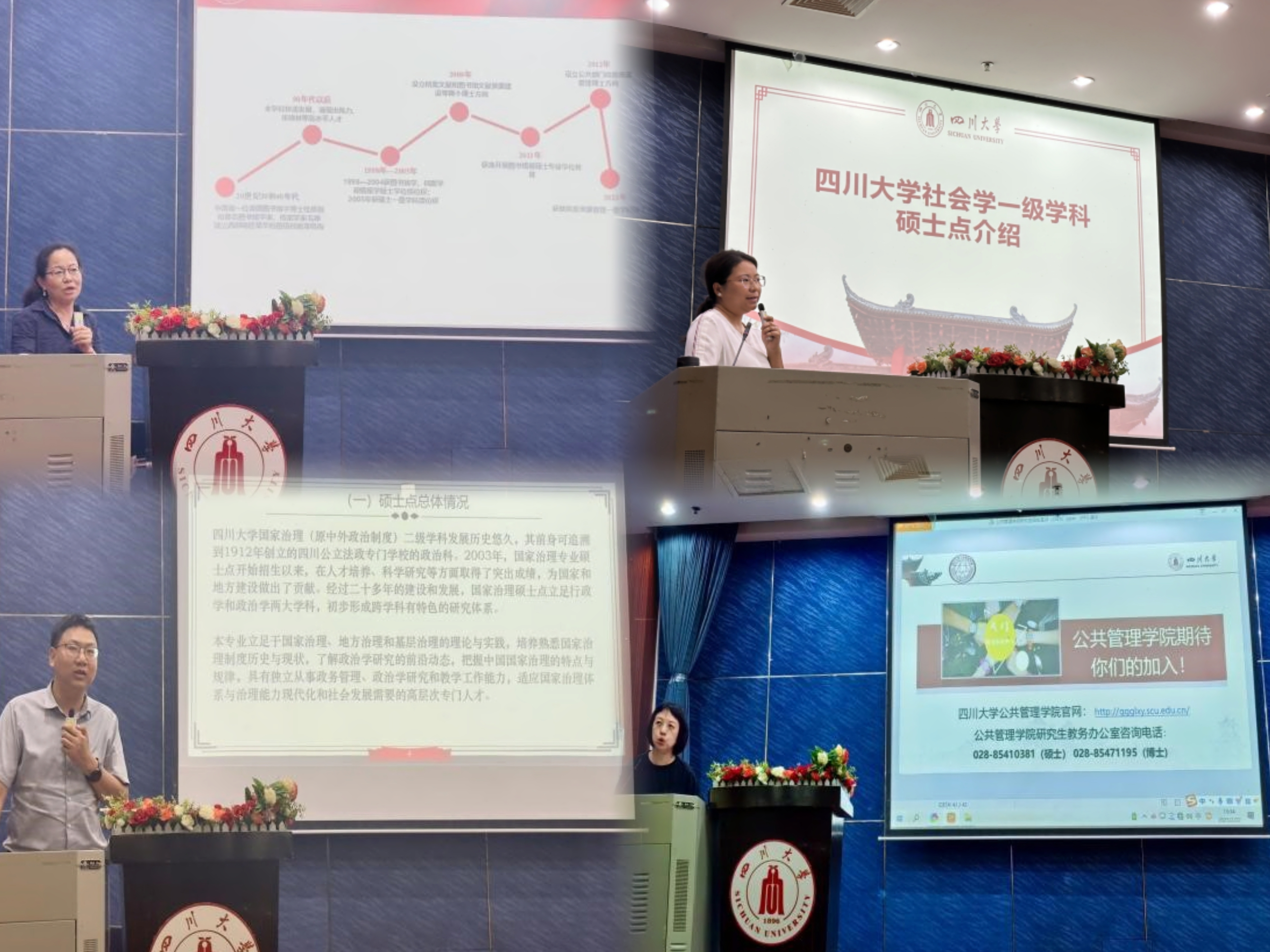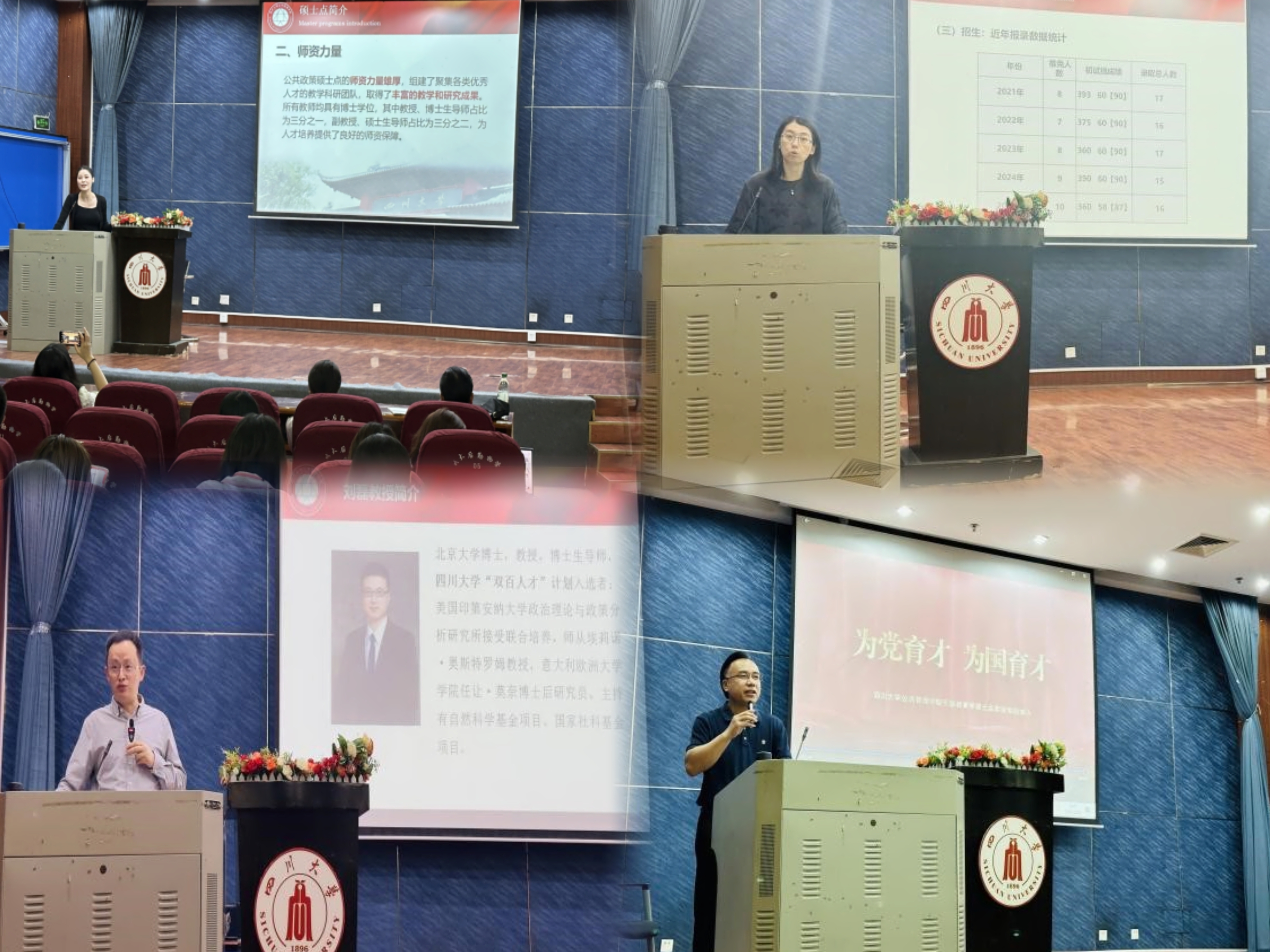 随后,公共政策曾路遥副教授、社会保障张浩淼教授、行政管理李强彬教授、干部教育学郭金云教授、社会学徐婷副教授、信息资源管理王萍教授、国家治理刘锐副教授分别通过视频或PPT从专业方向、课程设置、导师队伍、就业前景等对各学科的鲜明特色和培养优势进行了全面介绍,并对四川大学本科生继续留本院深造表示诚挚的欢迎。